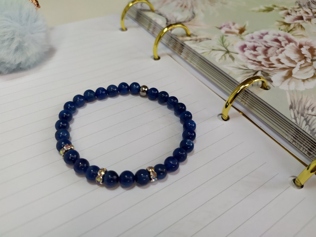 Použité polodrahokamy a minerály: kyanit modrý, kvalita AA! navlečený na pružnom elastomeri.